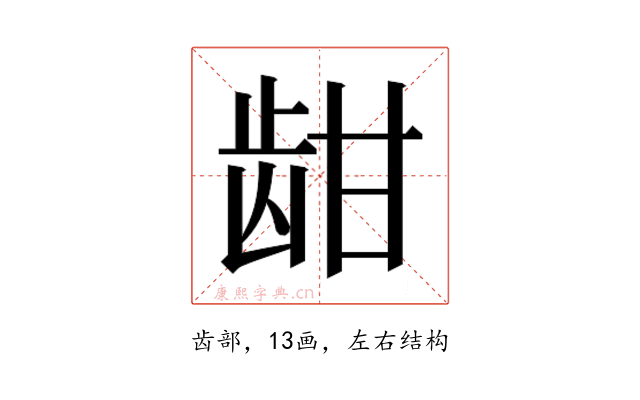 〔𬹾〕字是左右结构,可拆字为“齿、甘”。