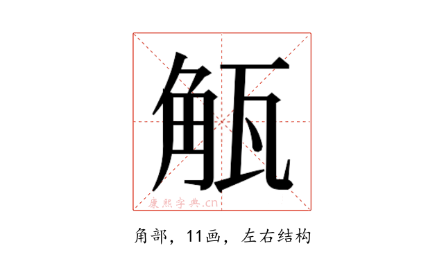 〔𮗩〕字是左右结构,可拆字为“角、瓦”。