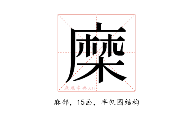 〔𮮈〕字部首是麻部,总笔画是15画。