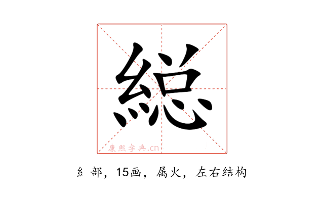 〔縂〕字是左右结构,可拆字为“糸、总”或“糹、总”,五行属-。