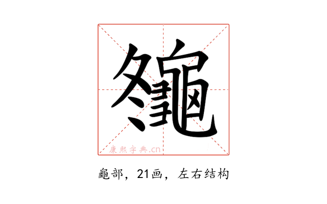 纠错〔䶱〕字拼音是(tóng),部首是龜部,总笔画是21画。