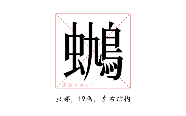 〔𰳟〕字是左右结构,可拆字为“虫、鳩”或“𰲩、鳥”。