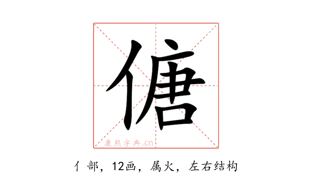 〔傏〕字是左右结构,可拆字为“亻、唐”。