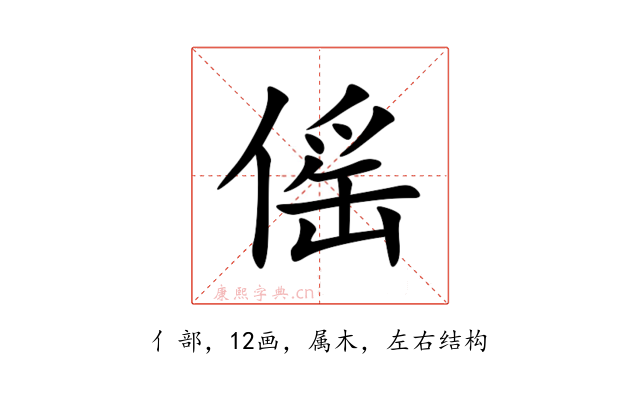 〔傜〕字是左右结构,可拆字为“亻、䍃”,五行属木。