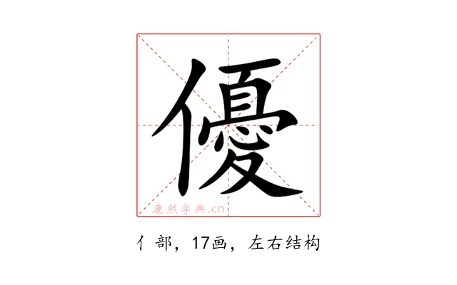 〔優〕字是左右结构,可拆字为“亻、憂”。