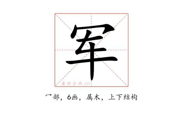 〔军〕字是上下结构,可拆字为“冖、车”,五行属木。