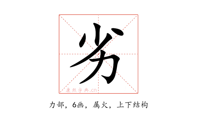 〔劣〕字是上下结构,可拆字为“少、力”,五行属火。