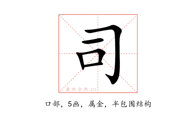 〔司〕字是半包围结构,可拆字为“𠃌、𠮛”,五行属金。