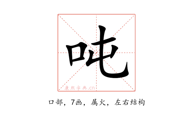 〔吨〕字是左右结构,可拆字为“口、屯”,五行属火。