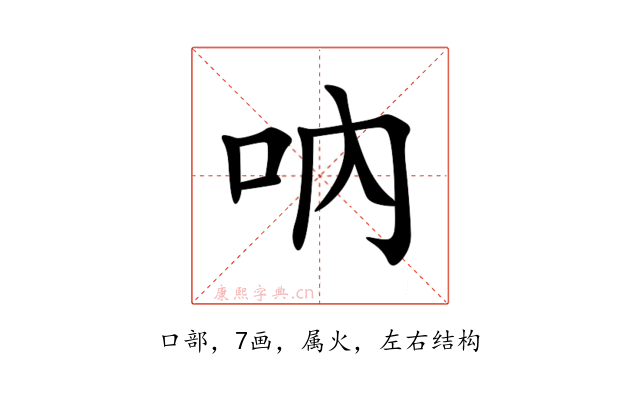 〔吶〕字是左右结构,可拆字为“口、内”或“口、內”。