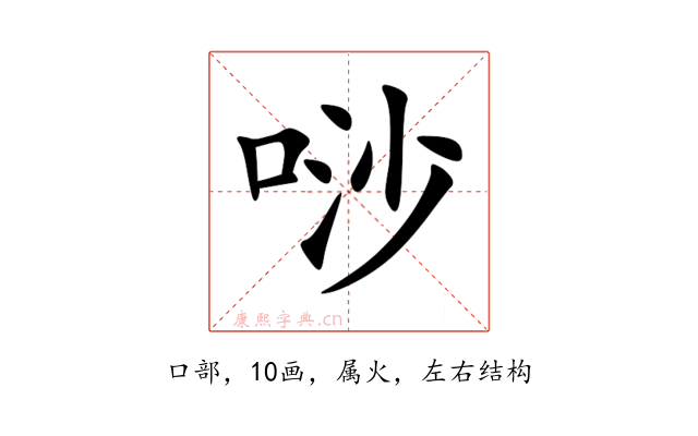 〔唦〕字是左右结构,可拆字为“口、沙”。
