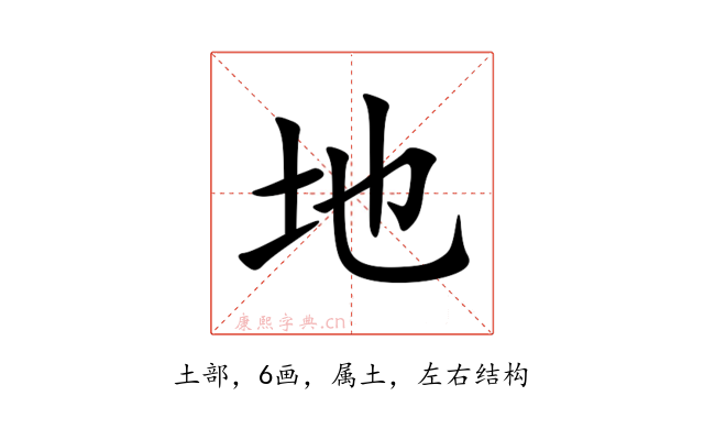 〔地〕字是左右结构,可拆字为“土、也”,五行属土。
