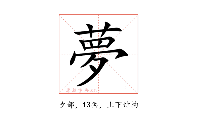 〔夢〕字是上下结构,可拆字为“𦭝、冖、夕”。