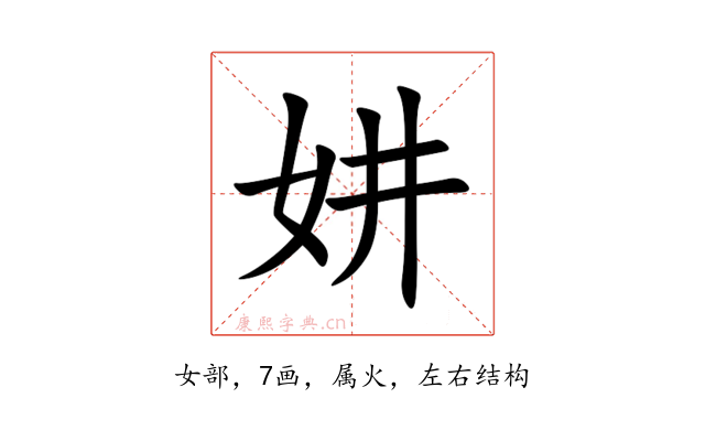 〔妌〕字是左右结构,可拆字为“女、井”。
