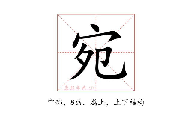 〔宛〕字是上下结构,可拆字为“宀、夗”,五行属土。