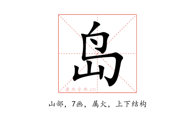 〔岛〕字是上下结构,可拆字为“丿、𠃌、丶、山”,五行属火。