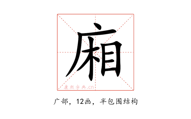 〔廂〕字是半包围结构,可拆字为“广、相”。