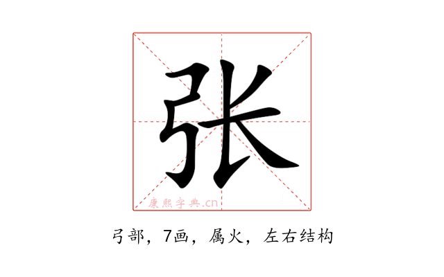 〔张〕字是左右结构,可拆字为“弓、长”,五行属火。