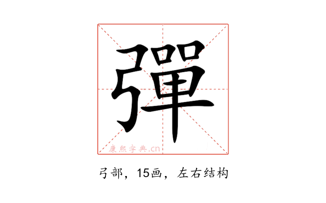 〔彈〕字是左右结构,可拆字为“弓、單”。