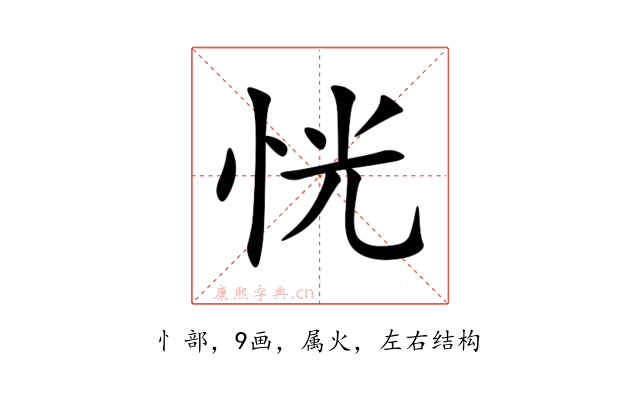 〔恍〕字是左右结构,可拆字为“忄、光”,五行属火。