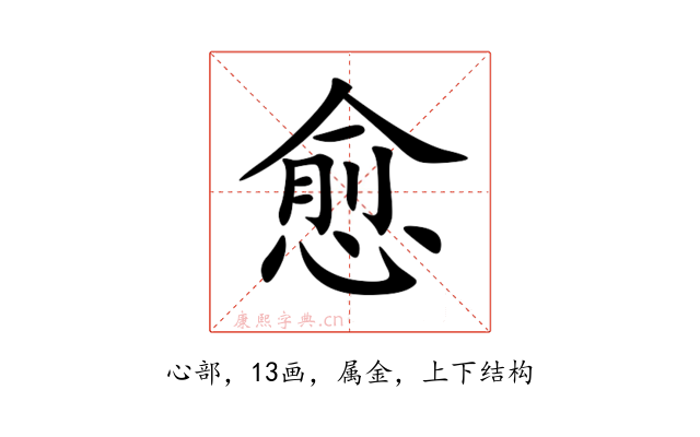 〔愈〕字是上下结构,可拆字为“俞、心”,五行属金。