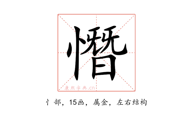 〔憯〕字是左右结构,可拆字为“忄、朁”,五行属金。
