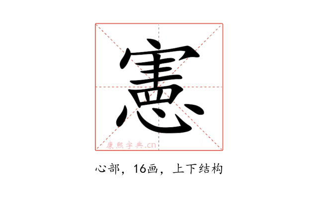 〔憲〕字是上下结构,可拆字为“𡩜、心”。
