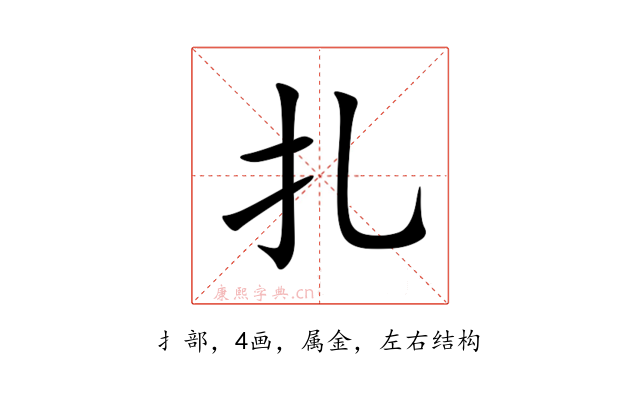 〔扎〕字是左右结构,可拆字为“扌、乚”,五行属金。