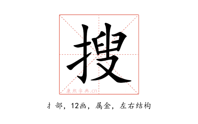 〔搜〕字是左右结构,可拆字为“扌、叟”,五行属金。
