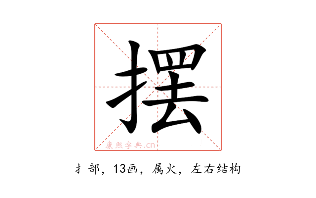 〔摆〕字是左右结构,可拆字为“扌、罢”,五行属火。
