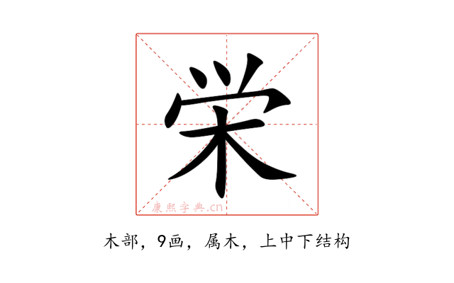〔栄〕字是上中下结构,可拆字为“𰃮、木”或“𰃮、朩”。