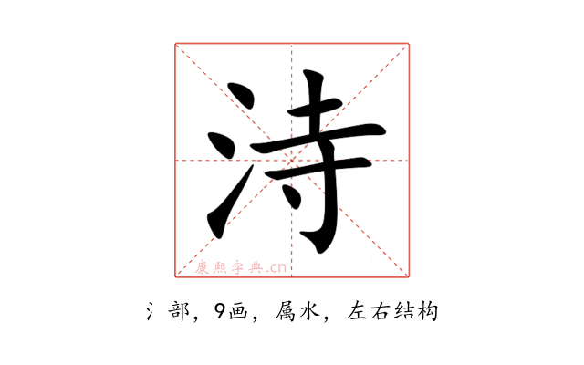 〔洔〕字是左右结构,可拆字为“氵、寺”。