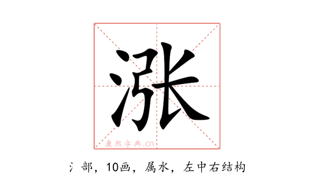 〔涨〕字是左中右结构,可拆字为“氵、张”,五行属水。
