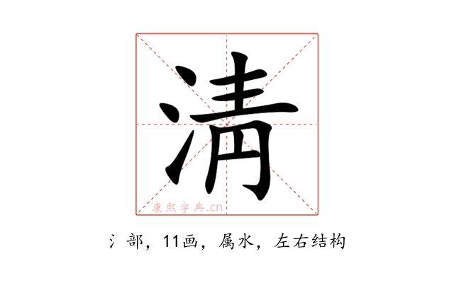 〔淸〕字是左右结构,可拆字为“氵、青”或“氵、靑”。