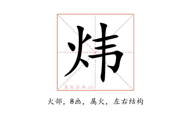 〔炜〕字是左右结构,可拆字为“火、韦”,五行属火。