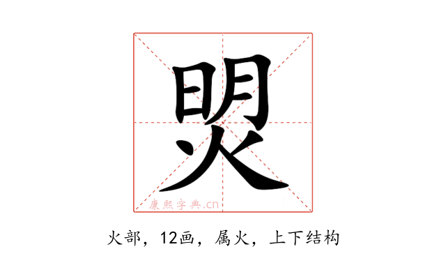 〔焽〕字是上下结构,可拆字为“明、火”。