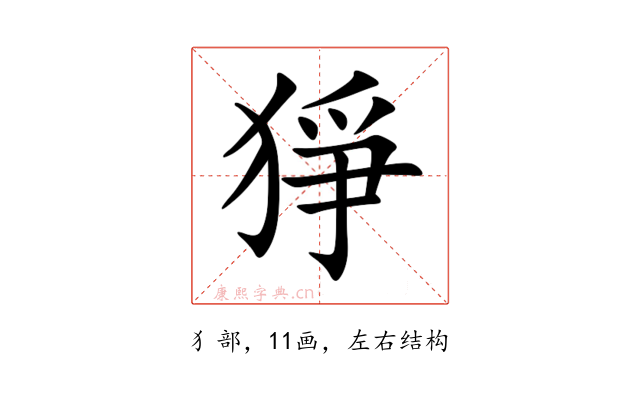 〔猙〕字是左右结构,可拆字为“犭、争”或“犭、爭”。
