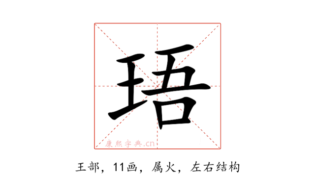 〔珸〕字是左右结构,可拆字为“王、吾”或“⺩、吾”。
