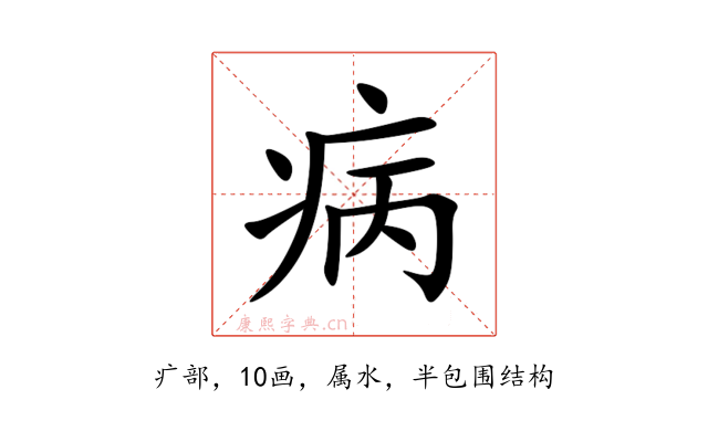〔病〕字是半包围结构,可拆字为“疒、丙”,五行属水。