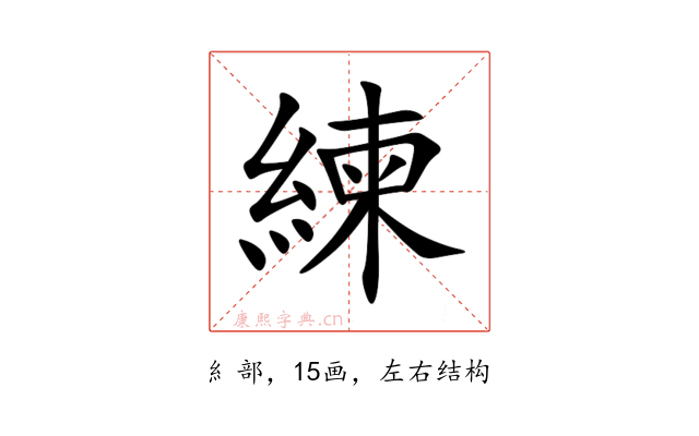 〔練〕字造字法是形聲。从糸( mì ),表示與線絲有關,柬聲。本义是把生絲煮熟;亦指把麻或織品煮得柔而潔白。