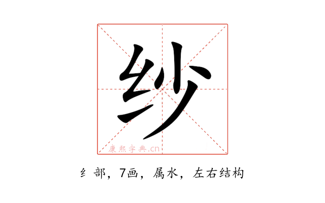 〔纱〕字是左右结构,可拆字为“纟、少”,五行属水。