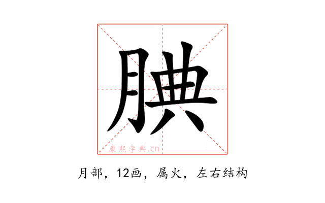 〔腆〕字是左右结构,可拆字为“月、典”或“⺼、典”,五行属火。