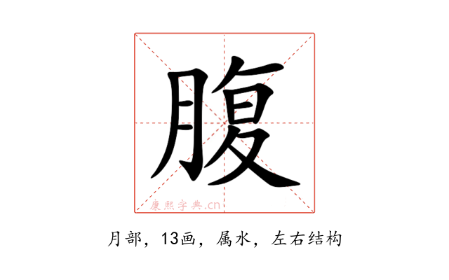 〔腹〕字是左右结构,可拆字为“月、复”或“⺼、复”,五行属水。