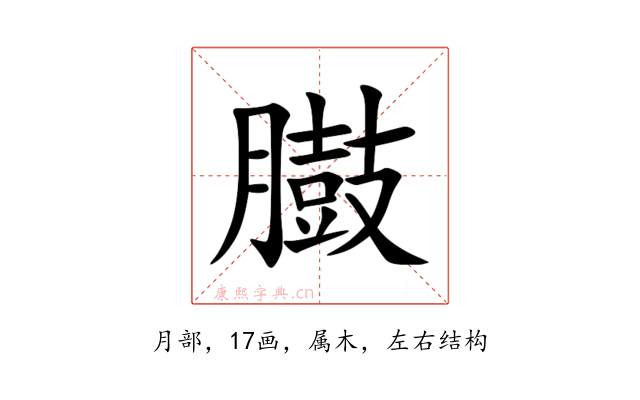 〔臌〕字是左右结构,可拆字为“䐍、支”或“⺼、鼓”,五行属木。