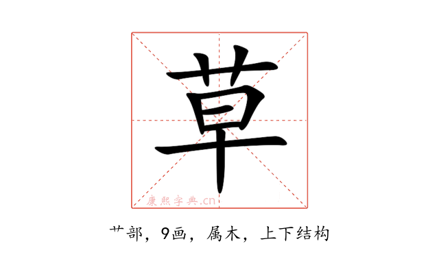〔草〕字是上下结构,可拆字为“艹、早”,五行属木。