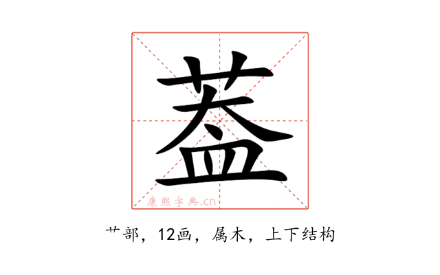 〔葢〕字是上下结构,可拆字为“艹、盇”。