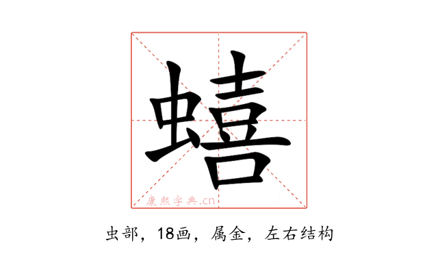 〔蟢〕字是左右结构,可拆字为“虫、喜”。