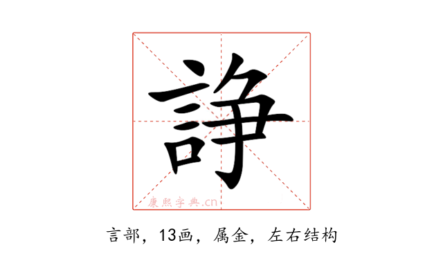 〔諍〕字是左右结构,可拆字为“言、争”或“訁、爭”。
