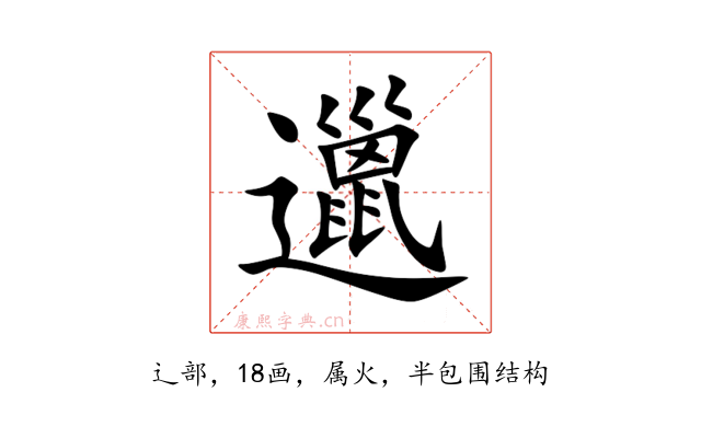 〔邋〕字是半包围结构,可拆字为“辶、巤”,五行属火。