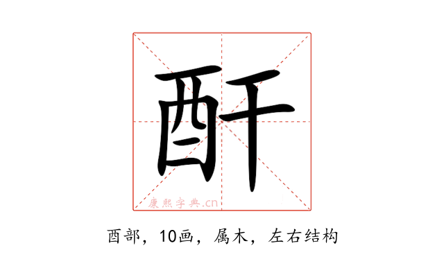 〔酐〕字是左右结构,可拆字为“酉、干”,五行属木。